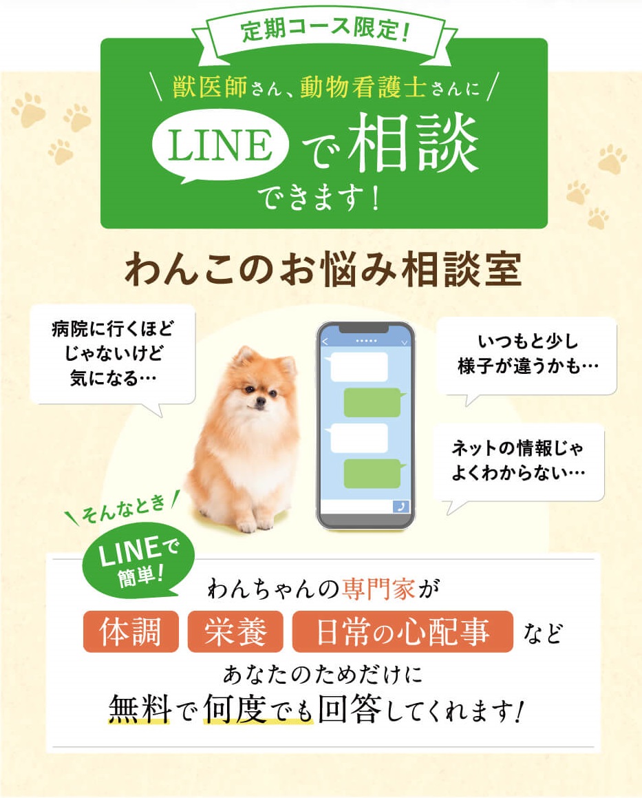また特典として、ワンちゃんのお悩みを専門家にLINEで相談することも可能となっています。